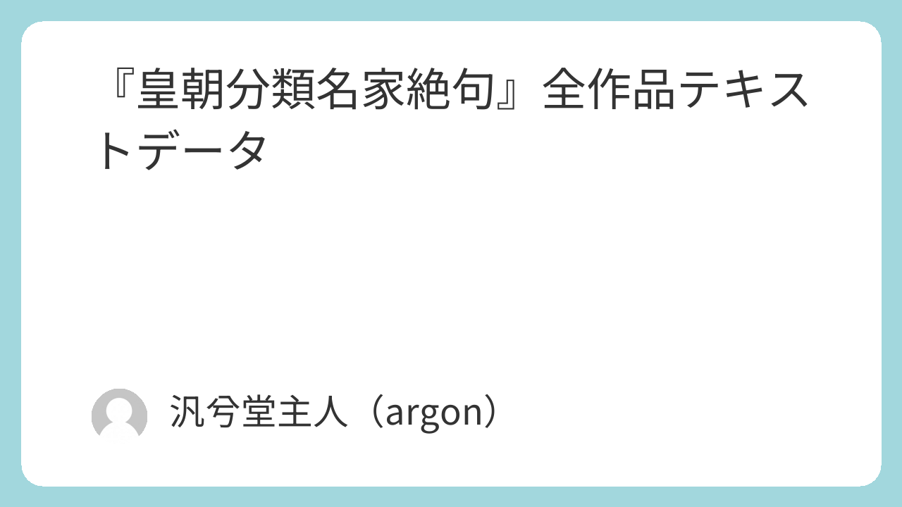このテキストデータは基本的に閲読目的で利用していただくのが良いと思う。検索をしたい場合は、「漢詩データベース検索 CanD」を利用してもらうほうが良い。異体字を含めて検索したり、パターンマッチング検索もできる。もちろん『皇朝分類名家絶句』全作品データを収録済みである。